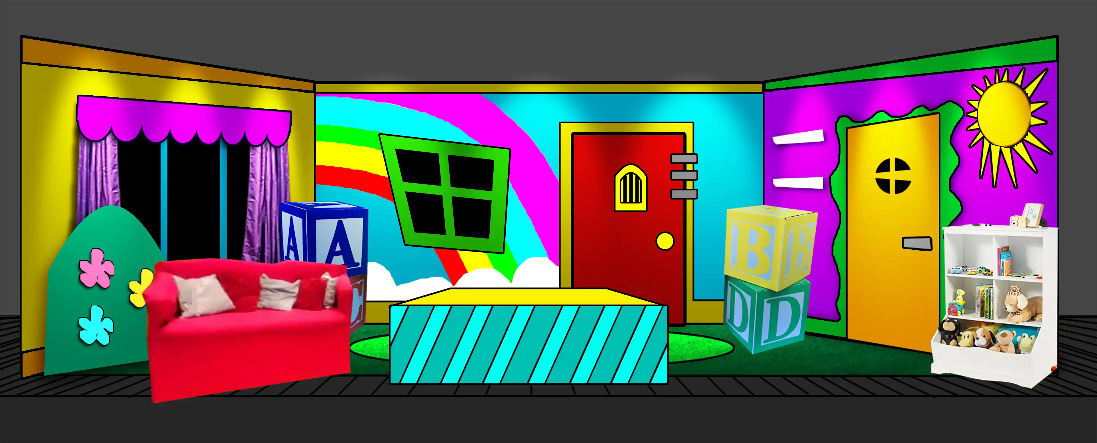 This is the original concept art for the title character's "fun house." It was used as the image prompt for the top image that rendered as a photo-real-looking piece of concept art using the prompt "dvd screengrab of a 90s live action children's tv show."
